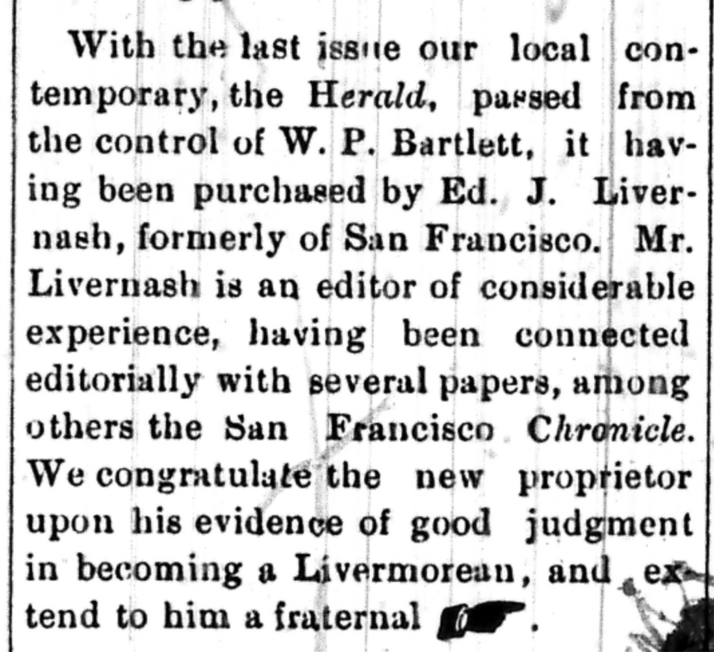 - Full Text: The Herald has changed hands. Mr. Livernash, formerly of the San Francisco Chronicle, has bought out Mr. Bartlett. He intends to make many improvements in the Herald and will no doubt give Livermore a thoroughly live paper.
