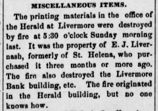- Full Text: A dispatch from Livermore on the 6th stated that Mr. Edward Livernash, of the Herald, lost his plant by fire. We greatly regret to note the above. Mr. Livernash only recently took charge of the business and had already made a great change in the paper. Fortunately he was insured.