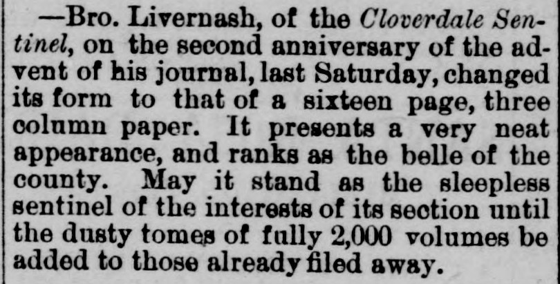 - Excerpt: Bro. Livernash, of the Cloverdale Sentinel, on the second anniversary of the advent of his journal, last Saturday, changed its form to that of a sixteen page, three column paper.