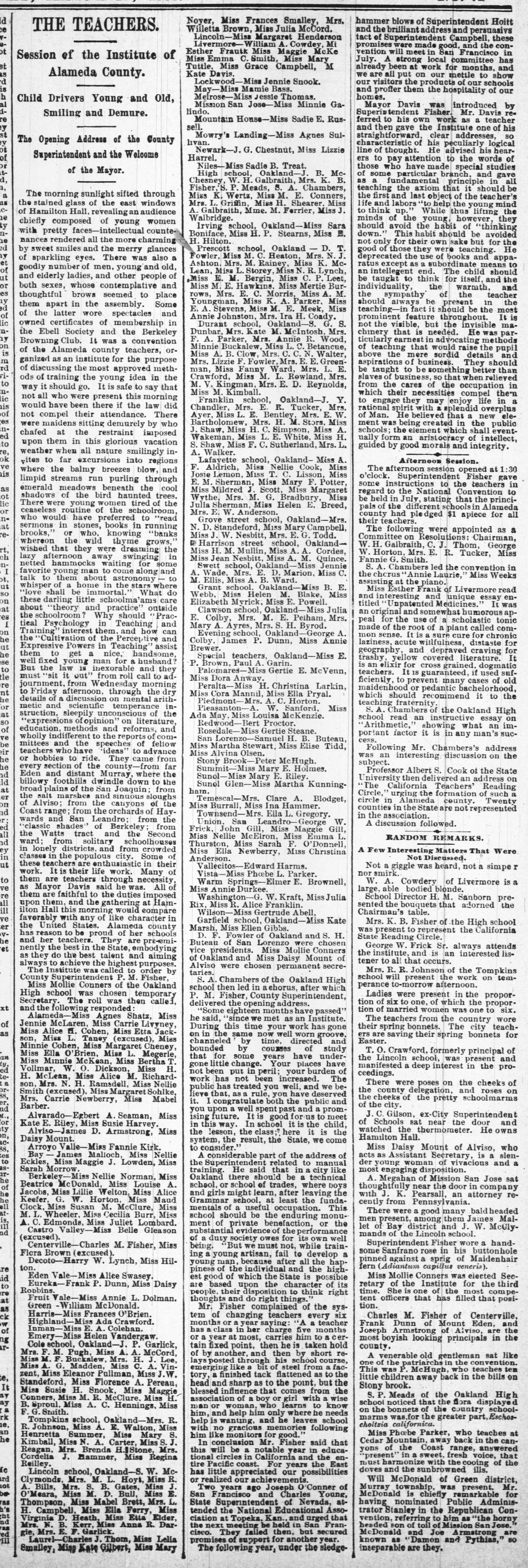 - Oakland Enquirer, 14 july 1905, pg 9, col 2, under "Livermore Trustees Elect School Teachers"
