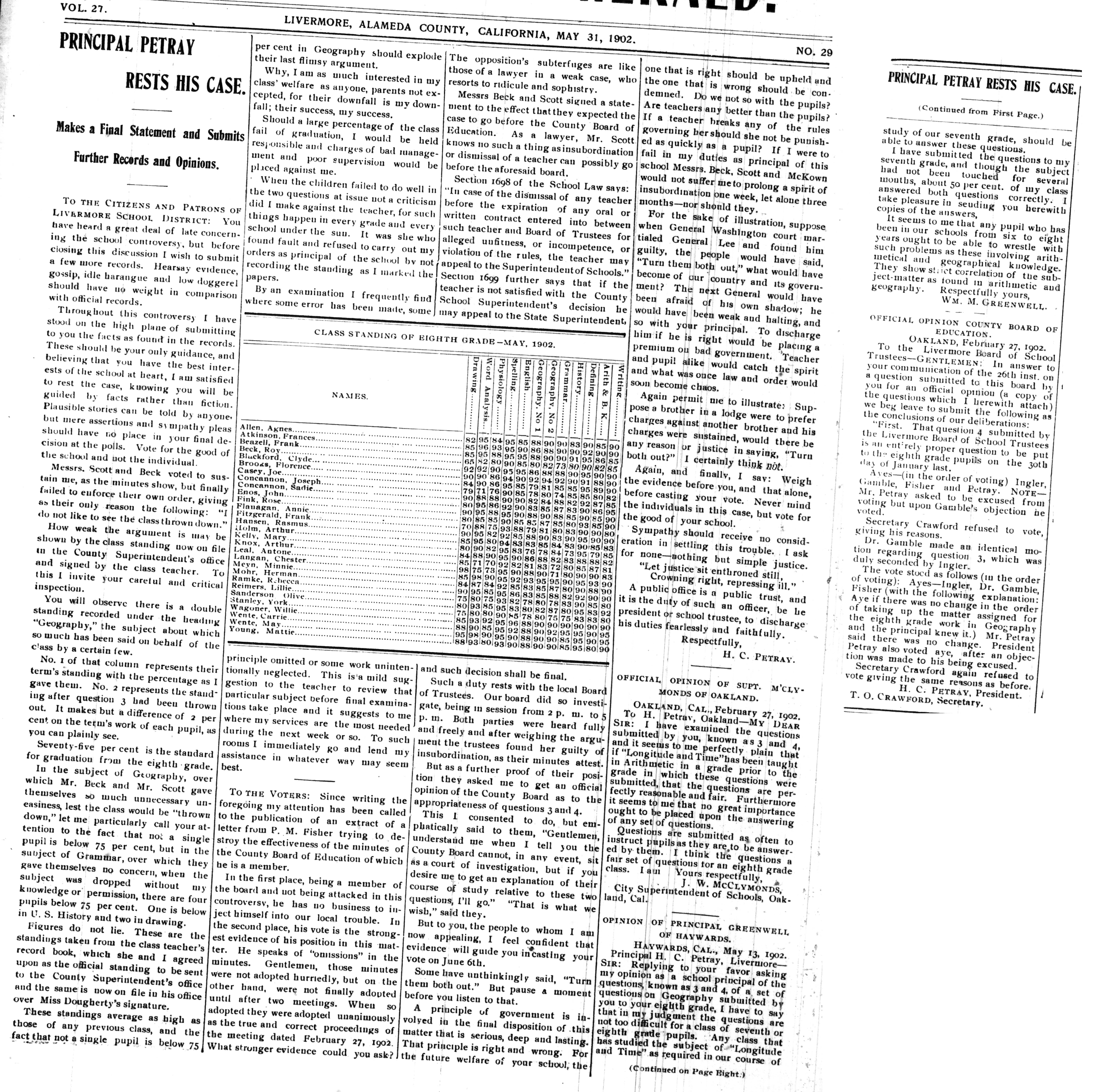 - Livermore Herald, 31 May 1902, pg 1, multiple columns, under "Principal Petray Rests his Case"