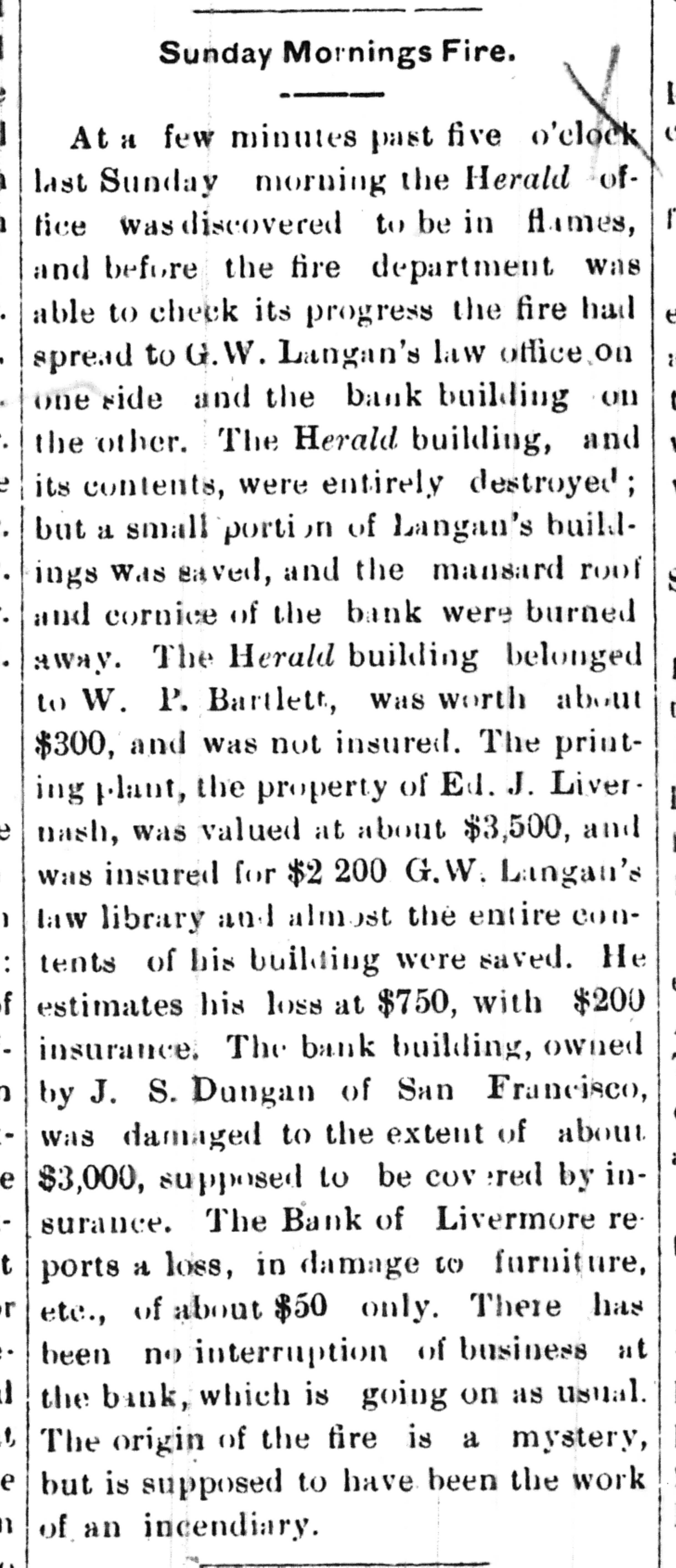 - Excerpt: It will be remembered by our readers that the Herald office was recently destroyed by fire and Mr. Livernash getting into a rather unfortunate perdicament by masquerading in female attire, never got another outfit. Mr. Dungan takes hold of the paper upon the earnest request of every business man in Livermore and has every assurance of success.