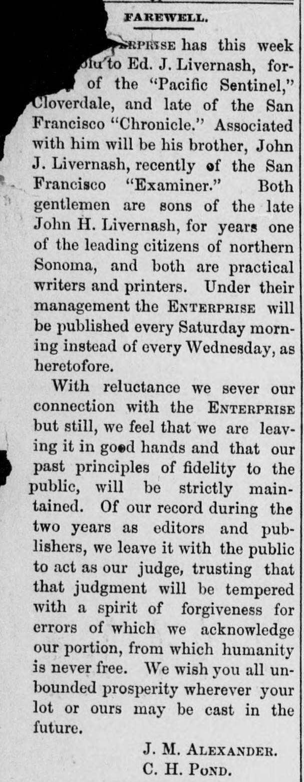 - Excerpt: The first number of a thirty-two column paper, called the Pacific Sentinel, published in Cloverdale, by Edward J. Livernash, has been received by us. It is a good looking paper, and is an honor to the town in which it is published. But, as there is little patronage in Cloverdale for one paper, we can not understand how two can succeed there, particularly when one of them is of the proportions of the Sentinel.