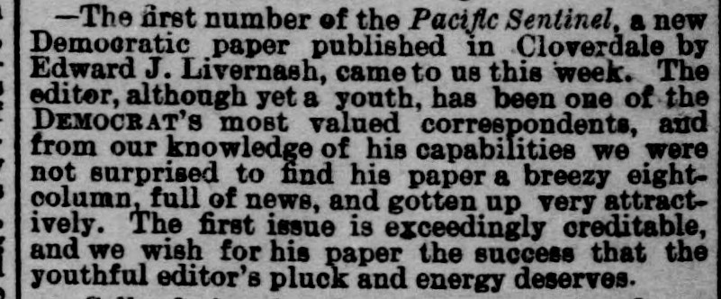 - Full Text: The first number of the Pacific Sentinel, a new Democratic paper published in Cloverdale by Edward J. Livernash, came to us this week. The editor, although yet a youth, has been one of the Democrat's most valued correspondents, and from our knowledge of his capabilities we were not suprised to find his paper a breezy eight-column, full of news and gotten up very attractively. The first issue is exceedingly creditable, and we wish for his paper the success that the youthful editor's pluck and energy deserves.