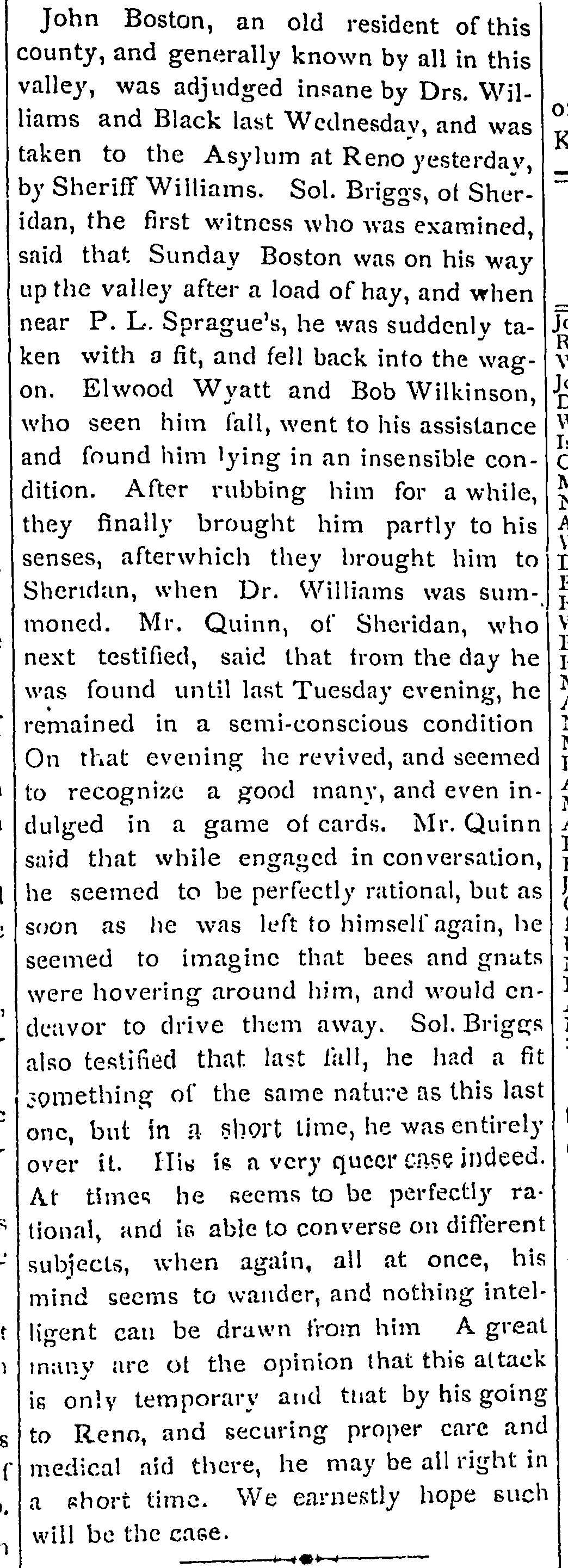 - Full Text: John Boston of Sheridan is insane. He was taken to Carson early this morning by Sheriff Williams and [?] Harris, where the unfortunate man will have an examination and then be placed in the Asylum at Reno.