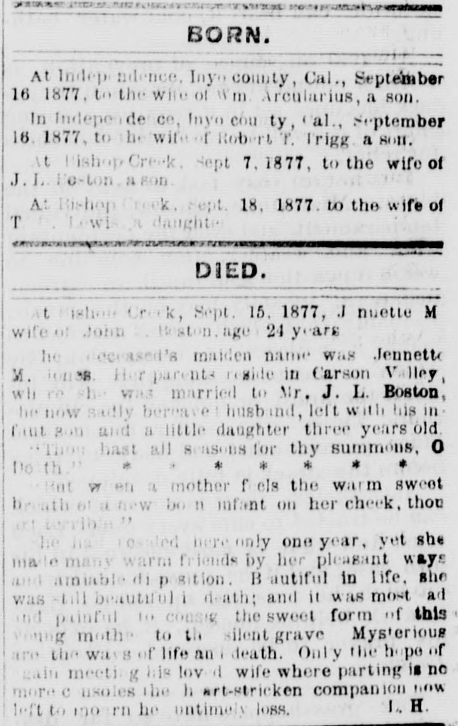 - Full text of the item under "Died": At Bishop Creek, Sept. 15, 1877, Jennette M. wife of John L. Boston, aged 24 years. The deceased's maiden name was Jennette M. Jones. Her parents reside in Carson Valley, where she was married to Mr. J. L. Boston, the now sadly bereaved husband, left with his infant son and a little daughter three years old. "Thou hast all seasons for thy summons, O Death. But when a mother feels the warm sweet breath of a new born infant on her cheek, thou art terrible." She had resided here only one year, yet she made many warm friends by her pleasant ways and amiable disposition. Beautiful in life, she was still beautiful in death; and it was most sad and painful to consign the sweet form of this young mother to the silent grave. Mysterious are the ways of life and death. Only the hope of again meeting his loved wife where parting is no more consoles the heart-stricken companion now left to mourn her untimely loss.