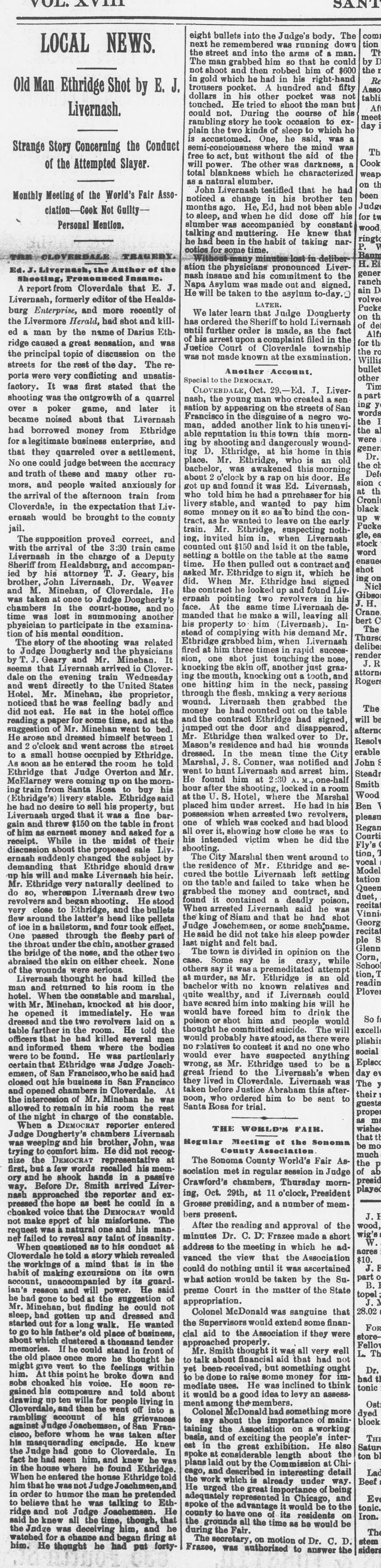 - Santa Rosa Daily Democrat, 30 Oct 1891, pg 1, col 1, under "Local News: Old Man Etheridge Shot by E. J. Livernash"