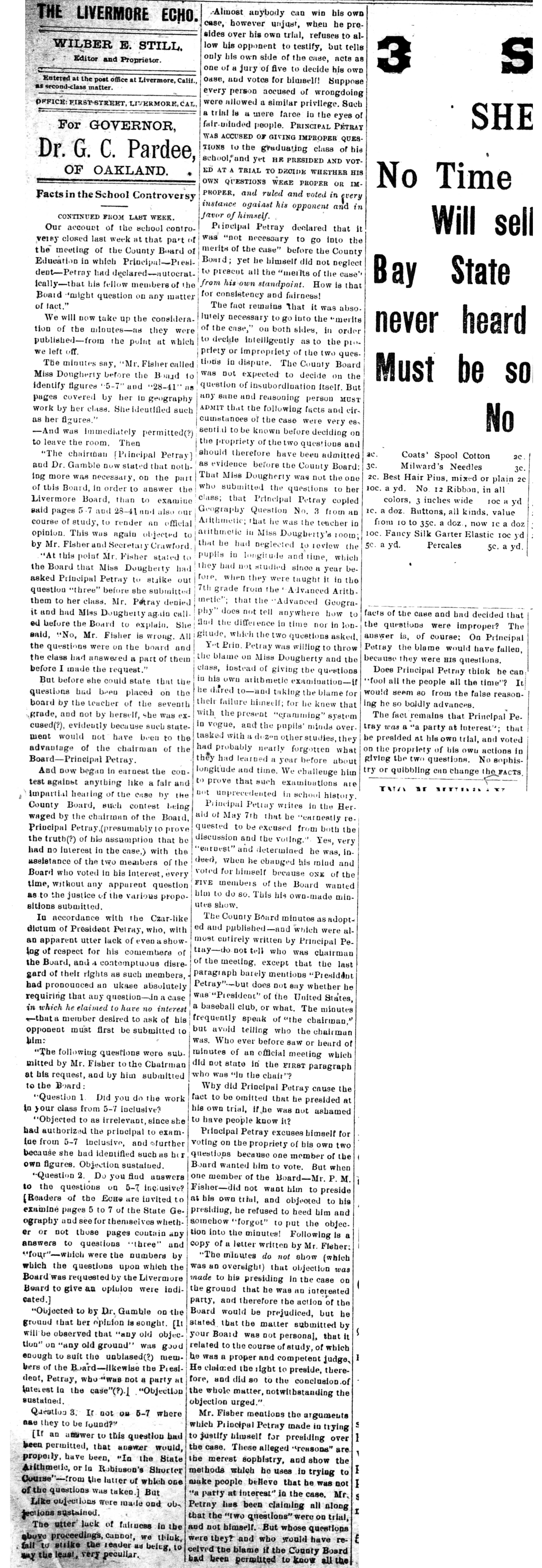- Livermore Echo, 22 May 1902, pg 3, multiple columns, under "Facts in the School Controversy"