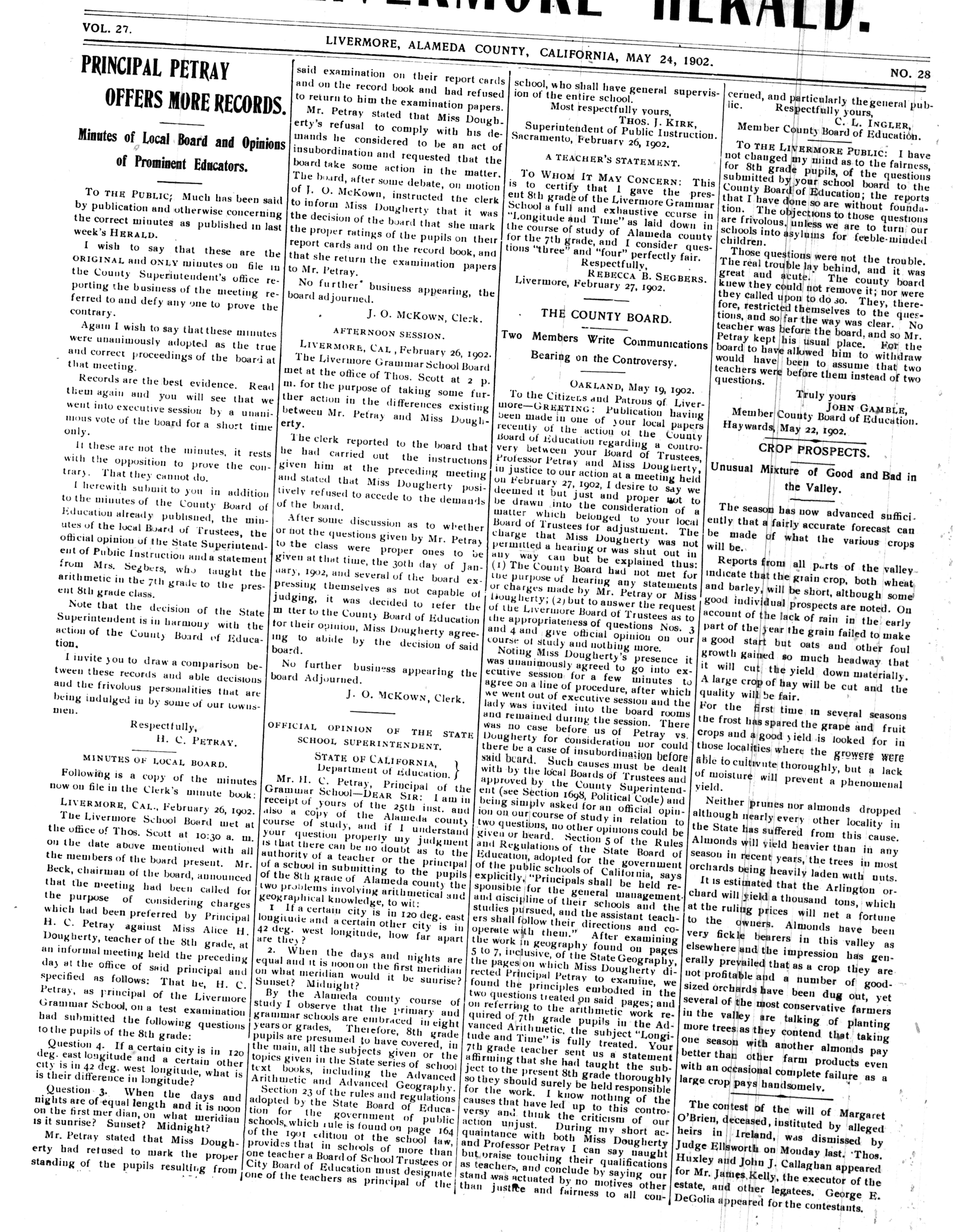 - Livermore Herald, 31 May 1902, pg 1, multiple columns, under "Principal Petray Rests his Case"